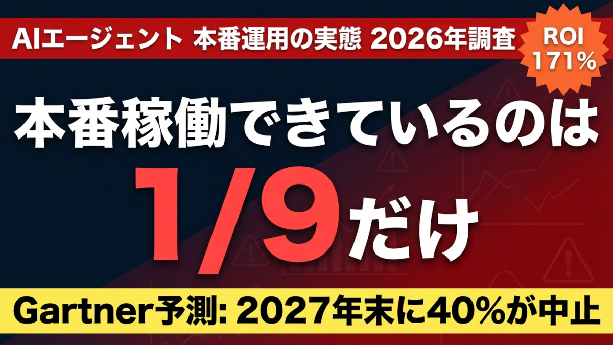 結論: 2026年のAIエージェント本番運用の実態は「72〜79%がテスト・パイロット段階」であり、本番稼働しているのは約1/9の企業にとどまります。Gartnerは2027年末までに40%以上のエージェントAIプロジェクトが中止されると予測しています。