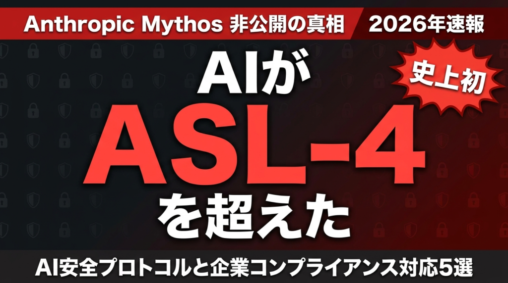 この記事では、Anthropicのai Safety Levels(ASL)フレームワークの全貌と、Mythos Preview非公開の経緯、そして企業のAI調達・ガバナンス担当者が今日から実践できる対応ステップを体系的に解説します。
