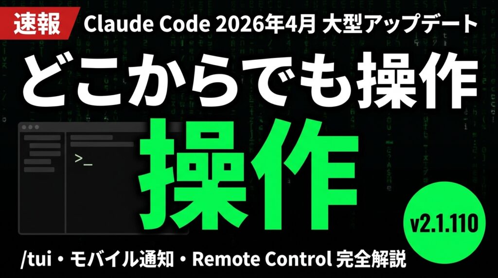 2026年4月のClaude Codeアップデート(v2.1.101〜v2.1.110)は、この問題に正面から答えた内容でした。モバイルプッシュ通知・Remote Control強化・/tui fullscreenと、「開発者の日常ワークフローの摩擦を削る」機能が一気に揃いました。