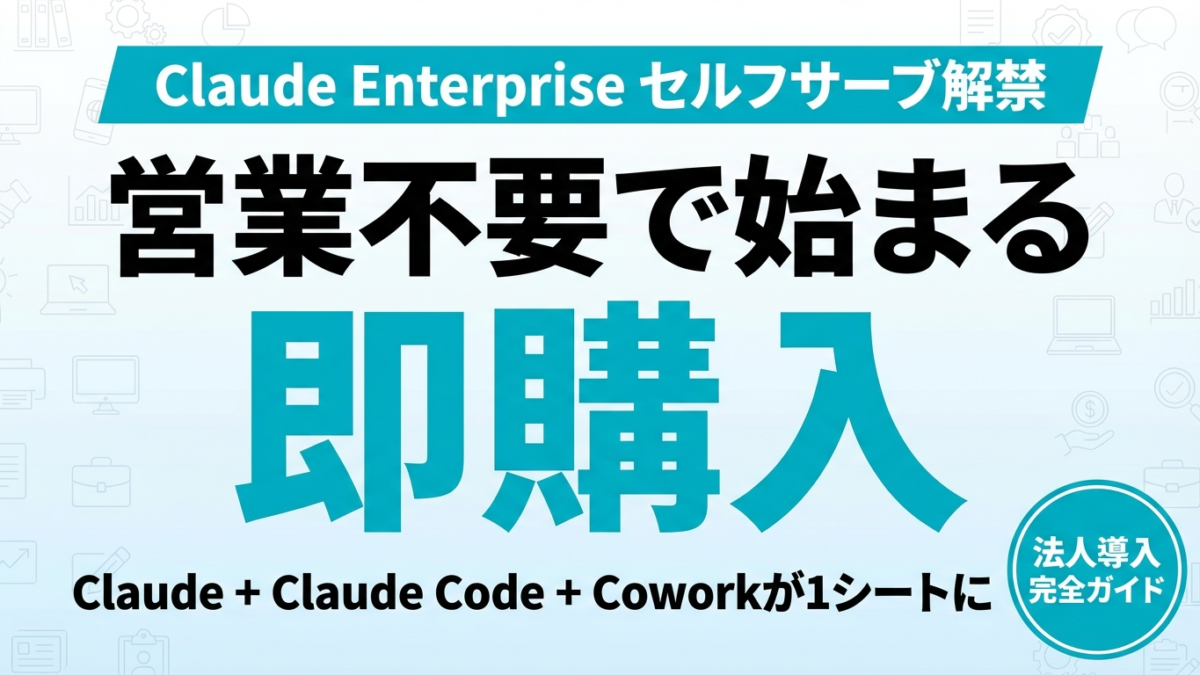結論: Claude Enterpriseが営業プロセスなしで直接購入可能になり、Claude + Claude Code + Coworkが1シートで利用できる法人向けプランとして、中小〜中堅企業の導入ハードルが大幅に下がりました。