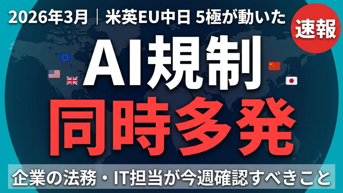 2026年3月は、AI規制の歴史において転換点として記録される月になるかもしれない。米・英・EU・中・日の5極が同時に動いたことで、「グローバルAI規制のパッチワーク」が一気に可視化された。