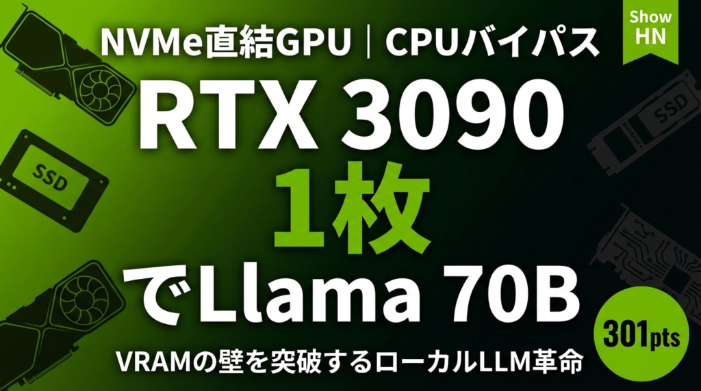 ところが2026年2月、この常識を覆すプロジェクトがHacker Newsに登場しました。その名は「ntransformer」。NVMe SSDからGPUメモリへダイレクトにデータを流し込み、CPUを完全にスキップするという、ちょっと信じがたいアプローチでLlama 3.1 70BをRTX 3090の1枚で動かしてしまったんです。