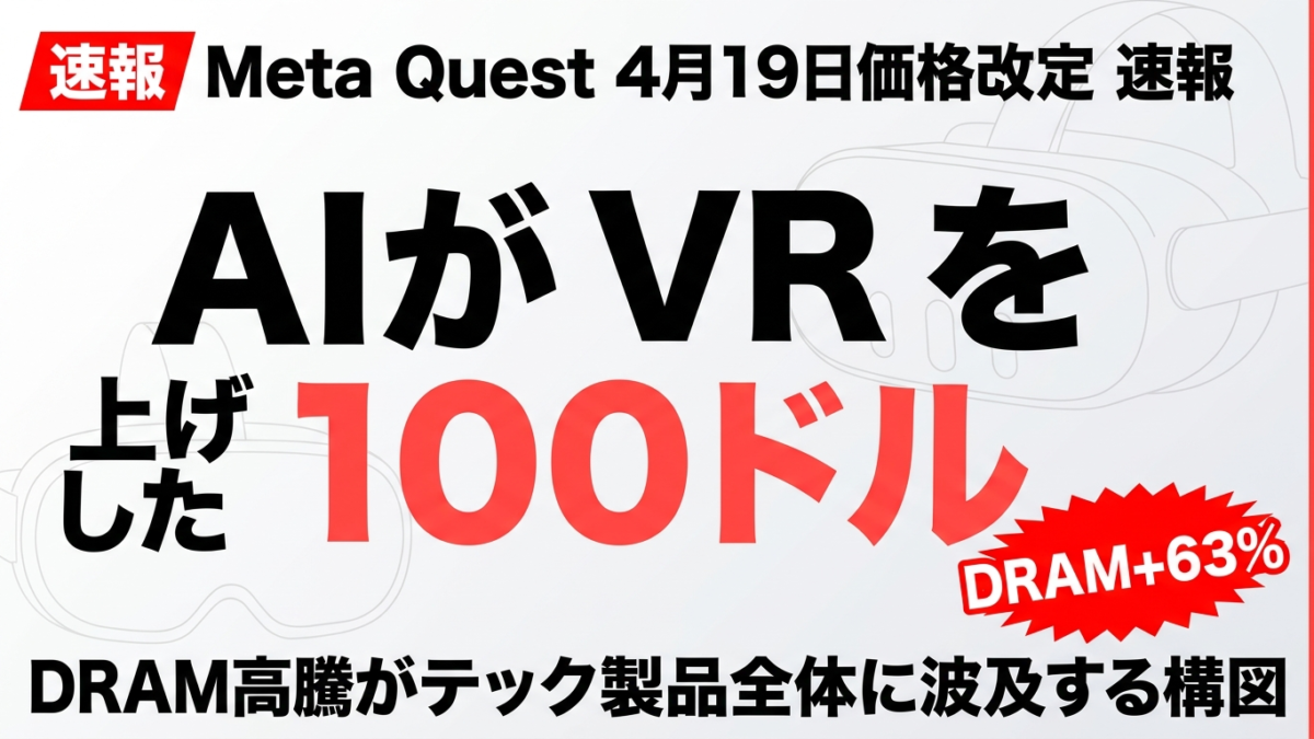 結論: Meta Quest 3が4月19日から100ドル値上げ(600ドルへ)、Quest 3Sも50ドル値上げ。原因はAIデータセンター需要によるDRAM価格の急騰で、TrendForceはQ2 2026にDRAM価格が58〜63%上昇すると予測。AI投資がVRを含む全テック製品のコスト構造を変えつつあります。
