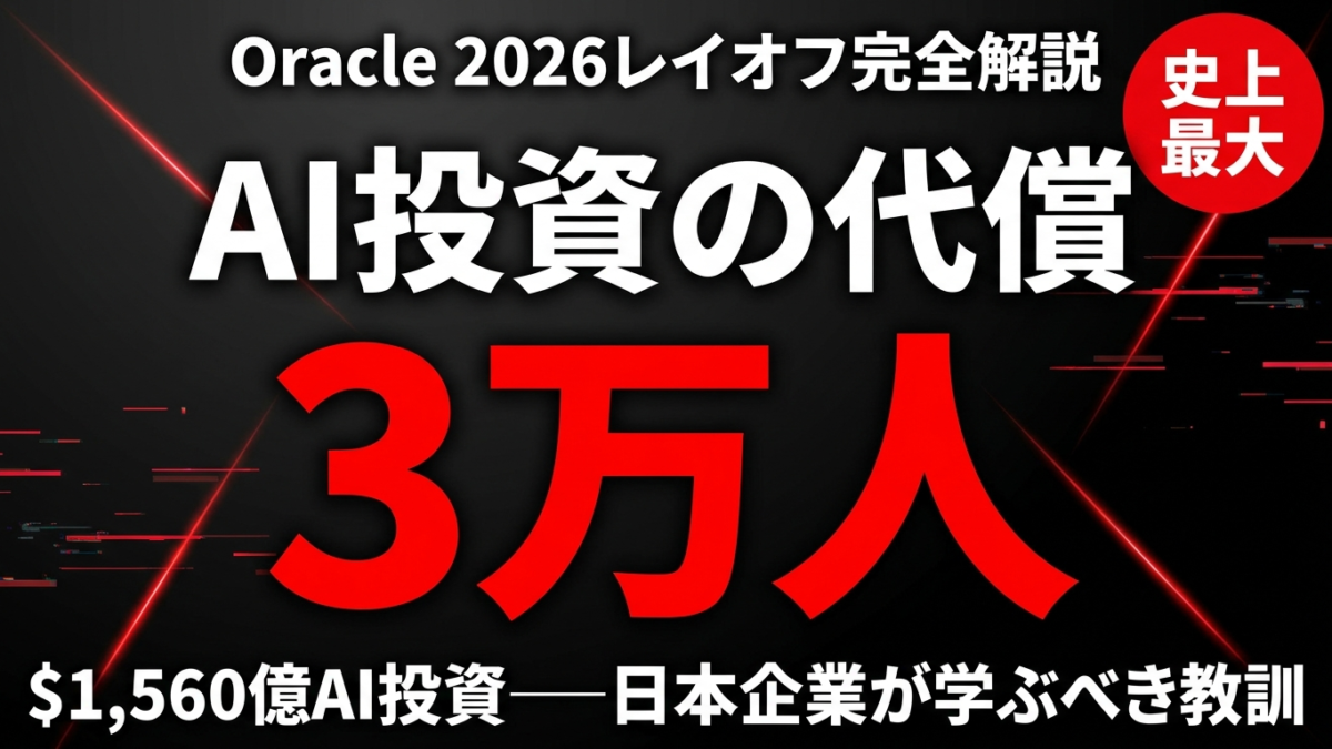 結論: Oracleは2026年3月31日から全社員の約18%にあたる最大3万人のレイオフを開始しました。理由は$1,560億のAIインフラ投資を支える資金確保です。これはAI投資のために人を削る「AI置換型経営」が大企業規模で実行された最初の事例の一つです。