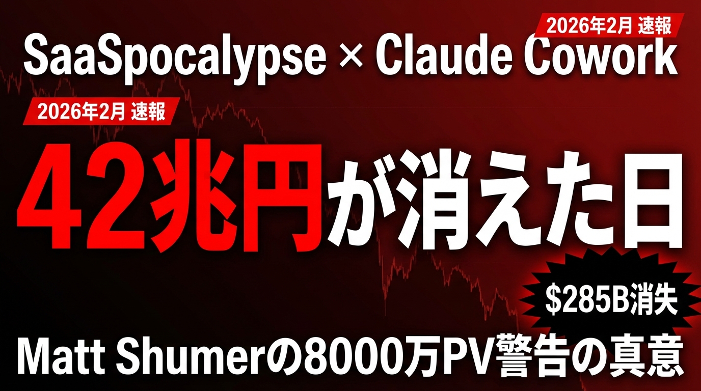 2026年2月3日、世界のSaaS・ソフトウェア企業の時価総額がわずか1日で約285B(約42兆円)吹き飛んだ。引き金を引いたのは、Anthropic社が発表した「Claude Cowork」の11個の新プラグイン。契約書レビュー、NDAトリアージ、法務ブリーフィング、営業CRM自動化、財務モデリング――これまで数百万円の年間ライセンス料を払って使っていた業務ソフトウェアの機能を、AIエージェントがまるごと代替しうることを示したのだ。