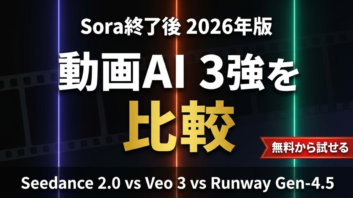 結論: Sora終了(2026年4月26日)で動画AI市場は三つ巴に再編。コスパならSeedance 2.0(月9.60ドル〜)、最高画質ならRunway Gen-4.5(月15ドル〜)、音声統合ならVeo 3.1(Google AI Pro 月19.99ドル〜)が2026年4月現在の最有力候補です。