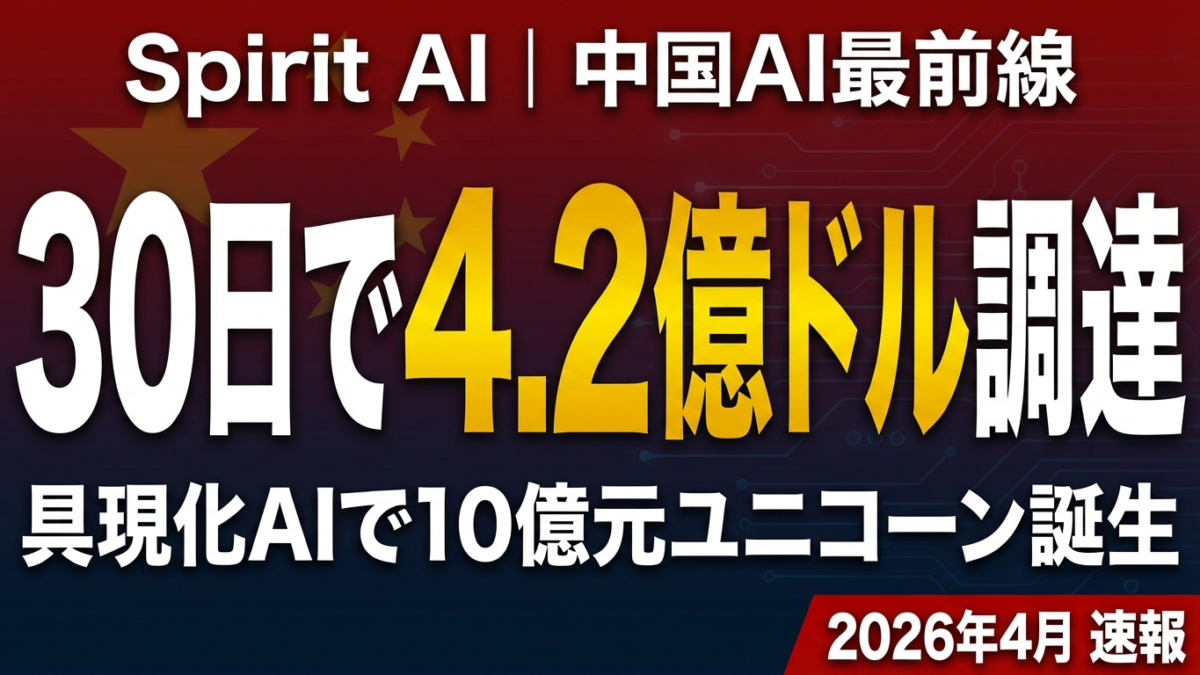 結論: 中国の具現化AIスタートアップ「Spirit AI」が30日間で約4.2億ドル(約615億円)を調達。雷軍とジャックマーのファンドが異例の共同出資。時価総額が10億元を超え、中国AI投資の加速を象徴する事案として注目されている。