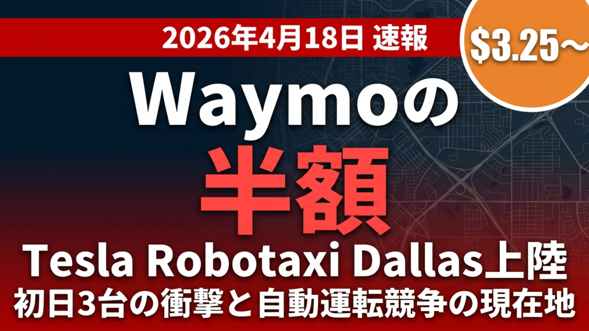 結論: Teslaは2026年4月18日にテキサス州DallasとHoustonで自動運転タクシーサービスを開始しました。料金はWaymoの約半額($3.25基本料+$1/マイル)ながら、台数は両都市合計3台という極めて限定的な初期展開です。